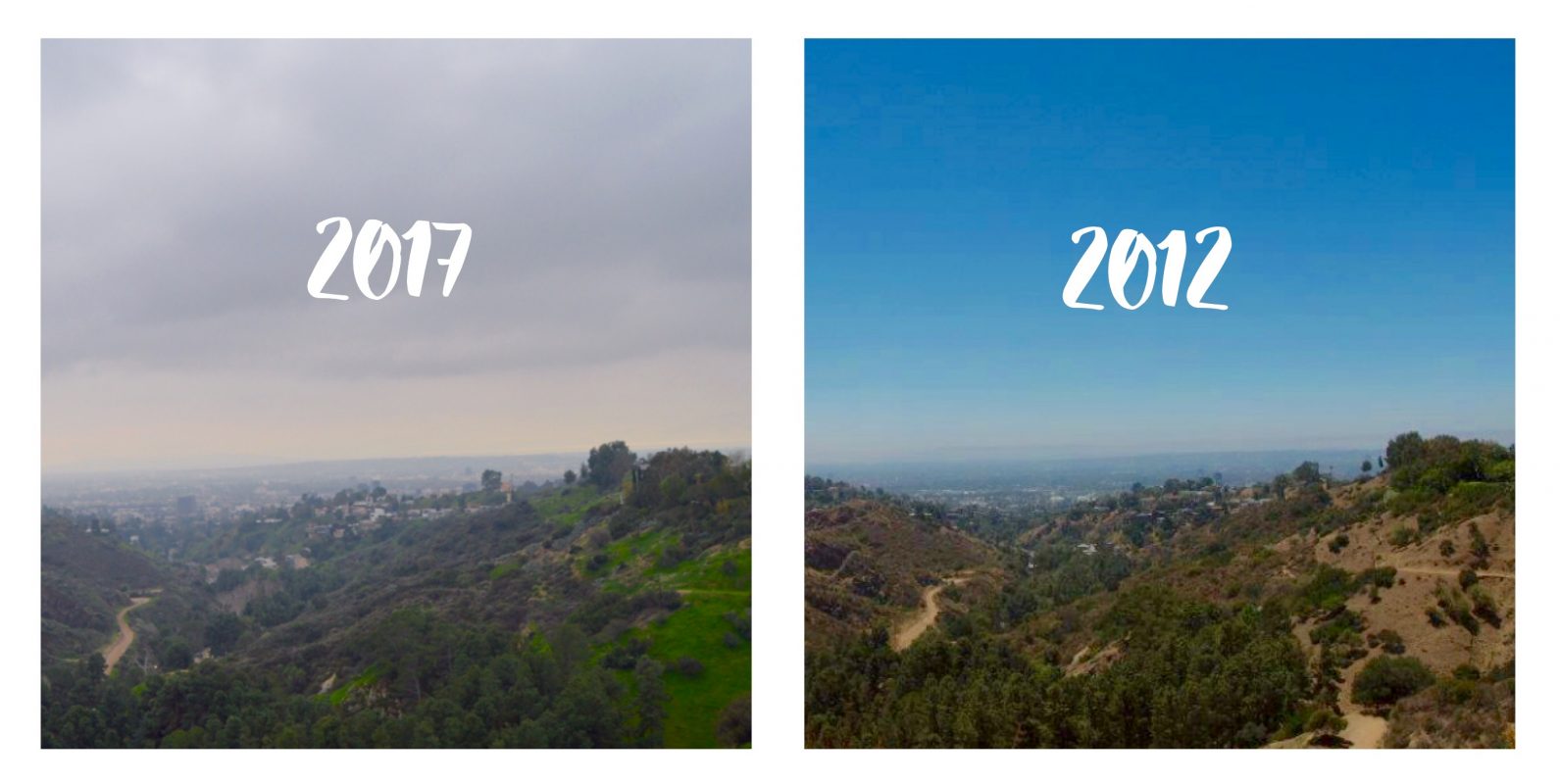 I actually found a picture from the exact spot I went to yesterday, from 5 years ago. It was the summer of 2012, so the sky was clear and bright blue (compared to February’s cloudy, rainy day), BUT look how green Griffith Park is right now! There is so much grass and plant life growing, which is somewhat rare to see. Usually it’s just dirt.
